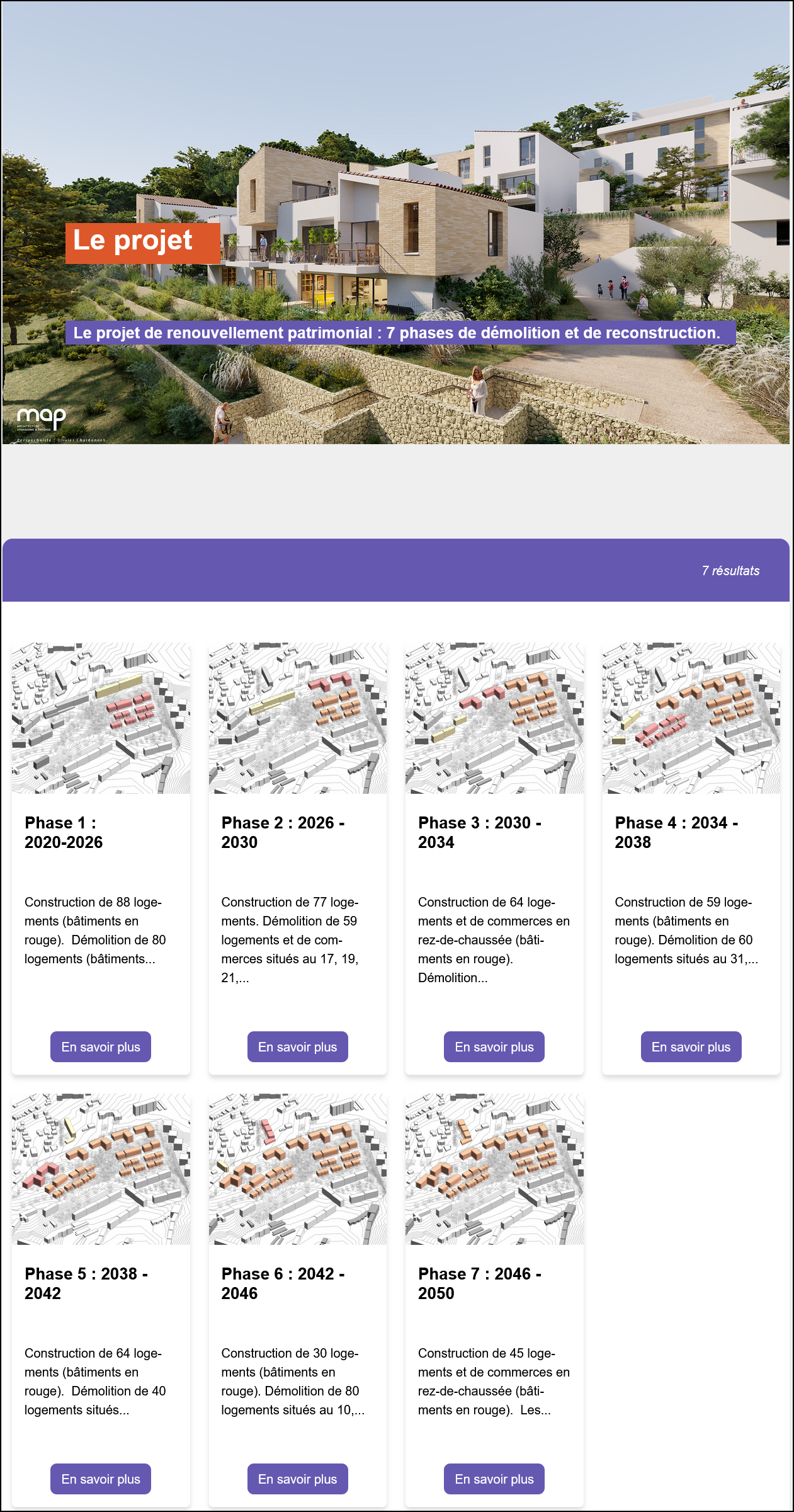 Dans le cadre de ce type d’opération, la plateforme est principalement utilisée comme une vitrine de présentation du projet de réhabilitation. C’est un lieu qui centralise l’ensemble des informations à connaître sur le projet. Les résident·es peuvent y trouver de nombreuses ressources utiles. Par exemple : le programme des travaux sur les bâtiments ou dans les logements, le planning d’intervention, etc. Ils peuvent ainsi avoir une idée précise de l’impact du projet sur leur quotidien.